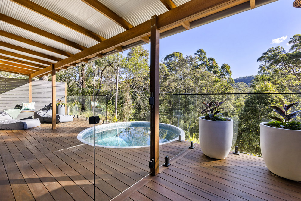 Your stunning plunge pool sits aloft the greenest of valleys with distant mountain views. Once a working water tank, now completely transformed…